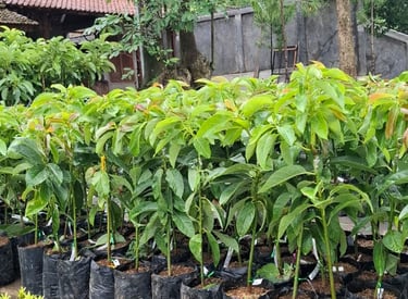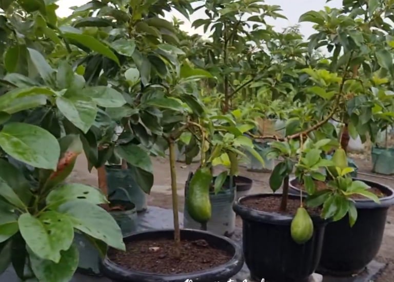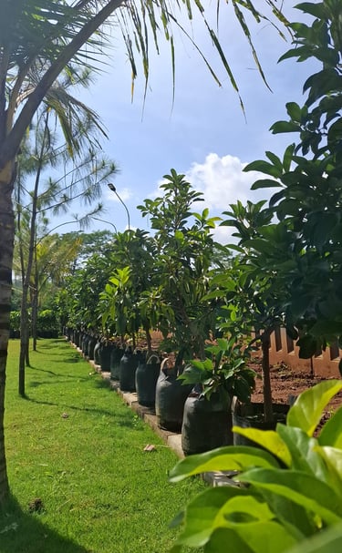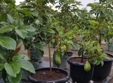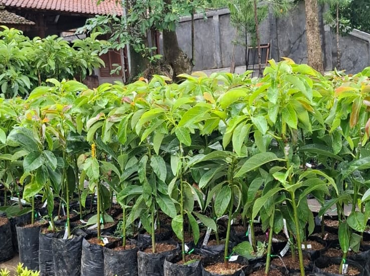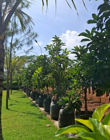 Menampilkan alpukat jumbo dalam pot (Tabulampot) yang tumbuh subur dan berbuah lebat di kawasan sekolah Mega IBS.